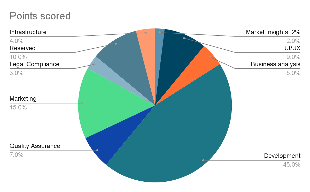 Observa el diagrama de presupuesto de una de las startups y nota que la fase de desarrollo representa solo el 45 %. Incluso si pudiéramos reducir esto en un 50 %, solo lograríamos una reducción del 22 % en el presupuesto total.